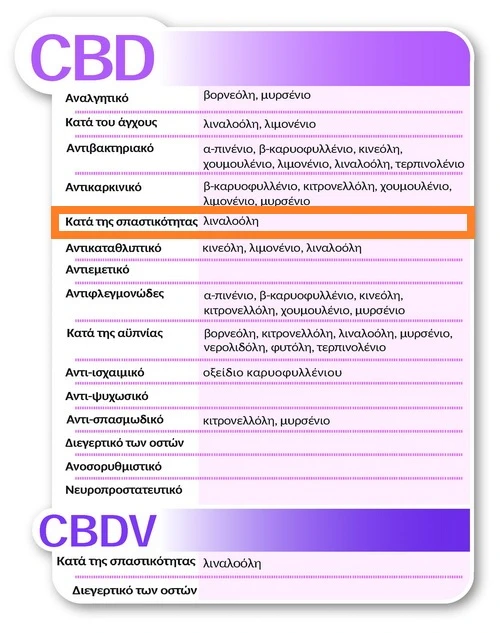 Η CBD έχει πολλές επιδράσεις, με τον συνδυασμό της όμως με ένα έλαιο Τερπενίων Κατά της Σπαστικότητας ενισχύεται επιπλέον η επίδραση της στην αντιμετώπιση της σπαστικότητας: